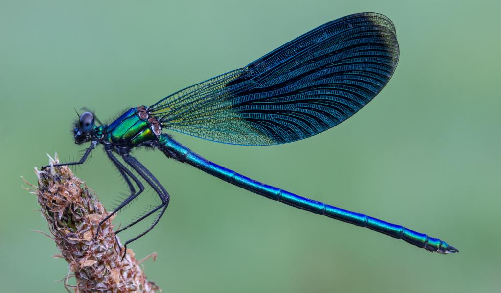 Обои Большая синяя стрекоза сидит на колоске