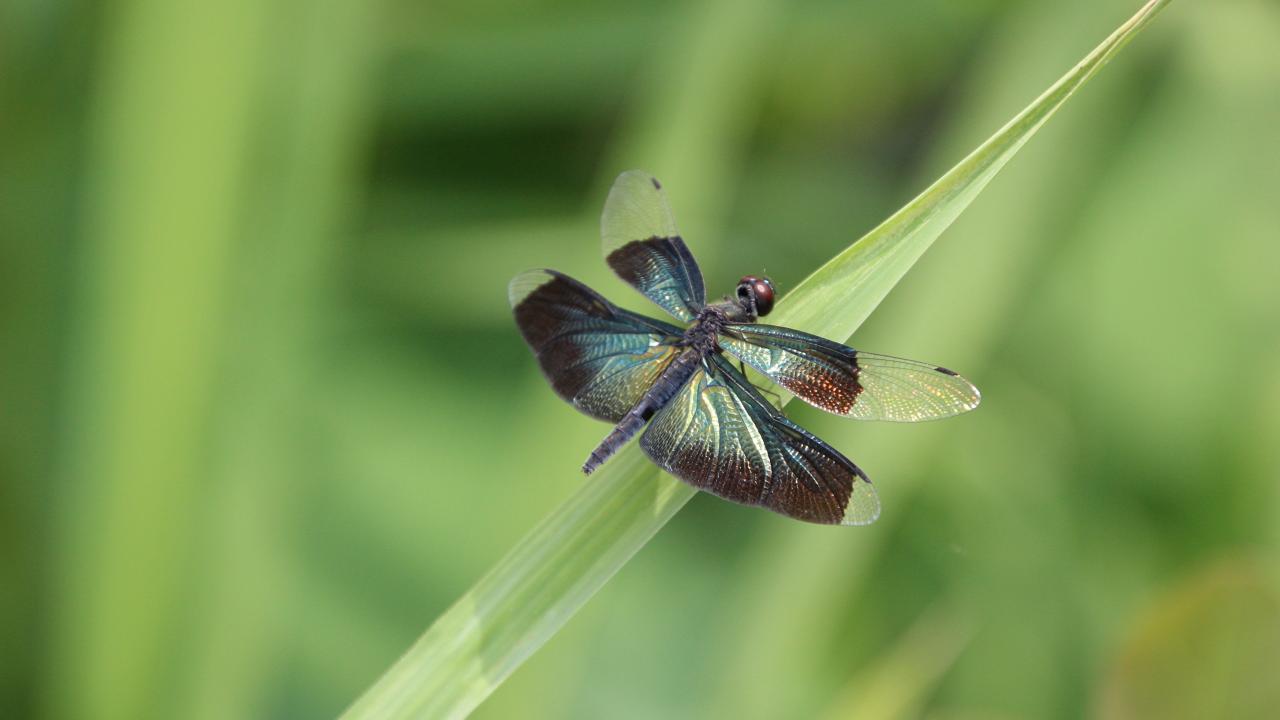 Обои Большая голубая стрекоза сидит на зеленой траве