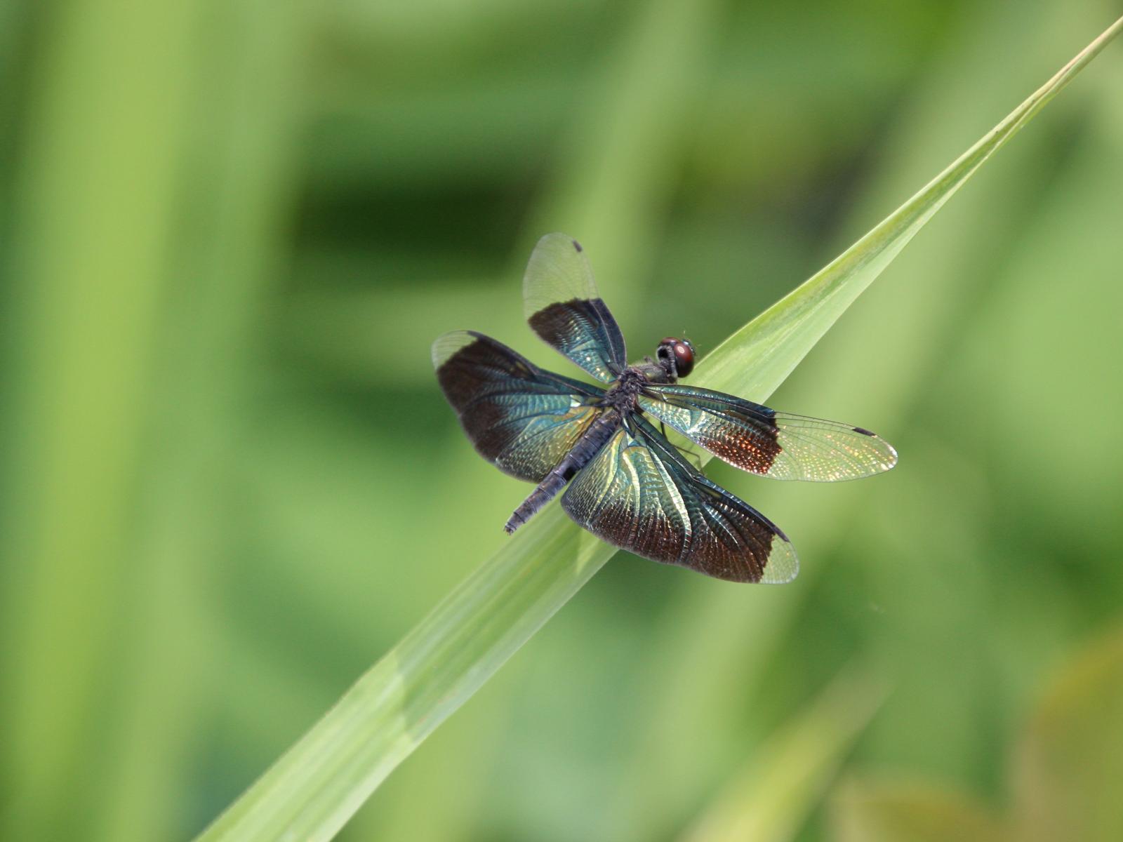 Обои Большая голубая стрекоза сидит на зеленой траве