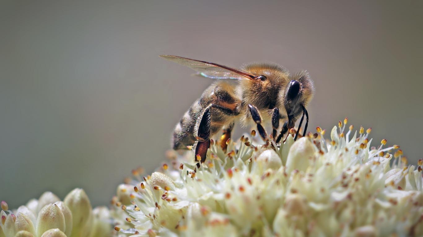 Обои Пчела собирает нектар на цветке на сером фоне