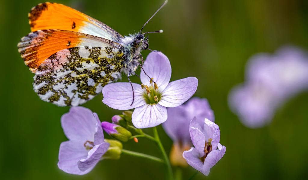Обои Маленькая бабочка сидит на розовом цветке