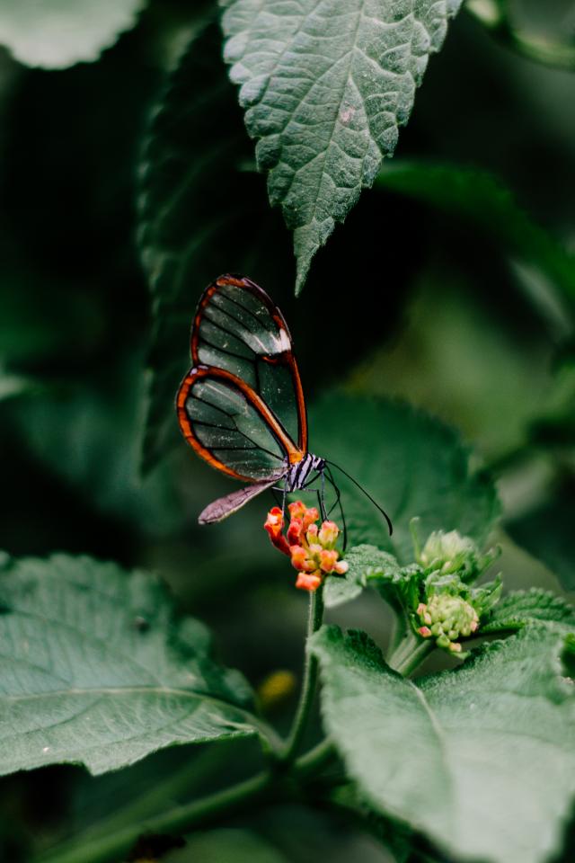 Обои Маленькая прозрачная бабочка сидит на цветке в зеленых листьях