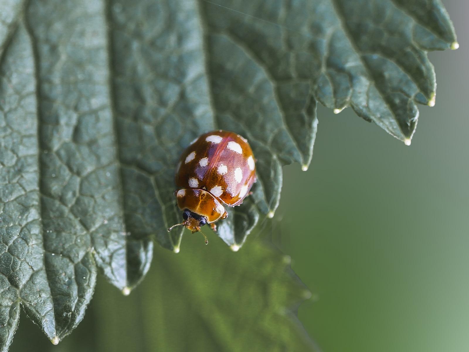 Обои Маленькая божья коровка на зеленом листе крупным планом