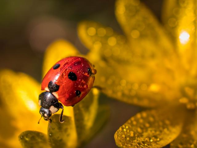Обои Красная божья коровка сидит на лепестках цветка