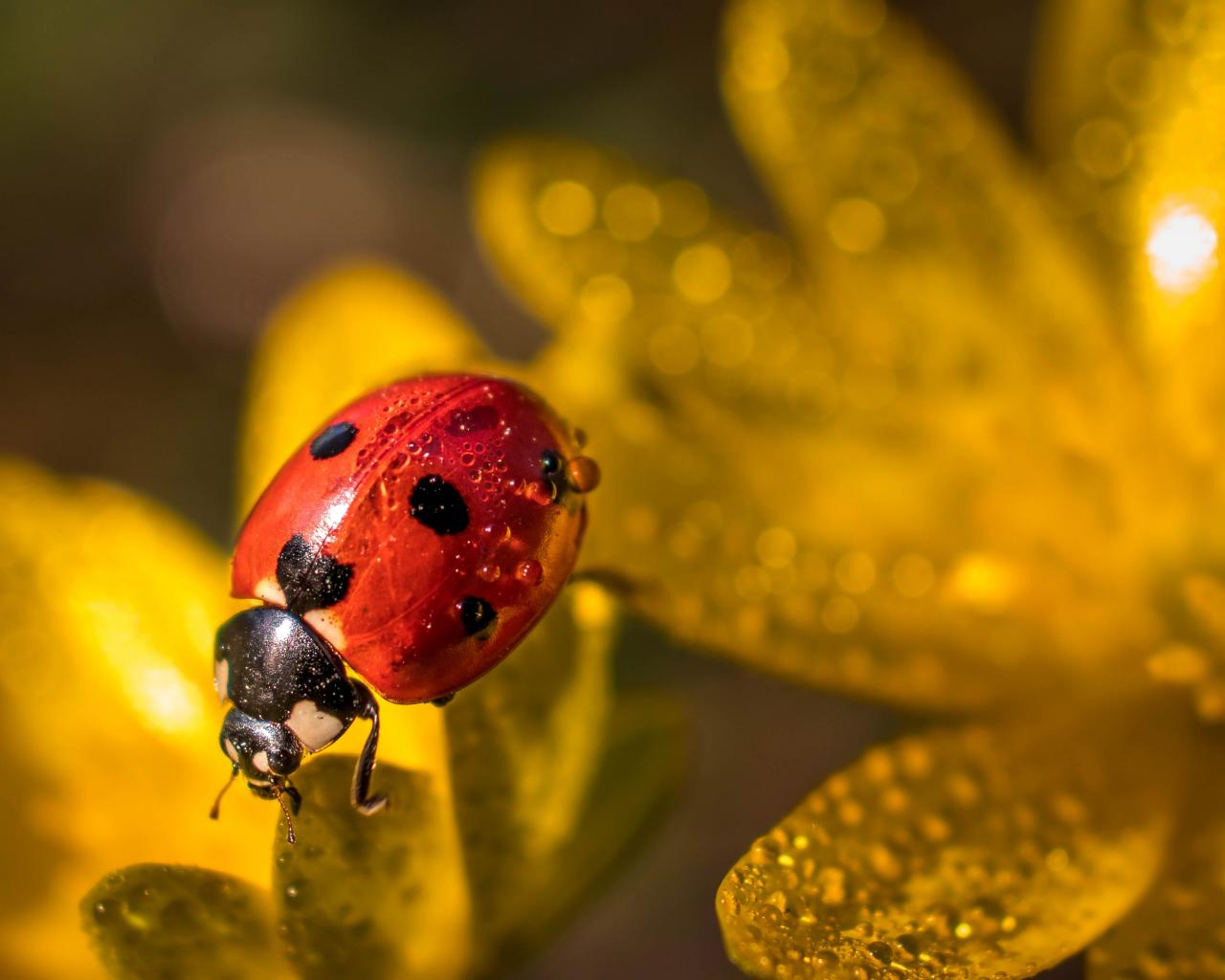 Обои Красная божья коровка сидит на лепестках цветка