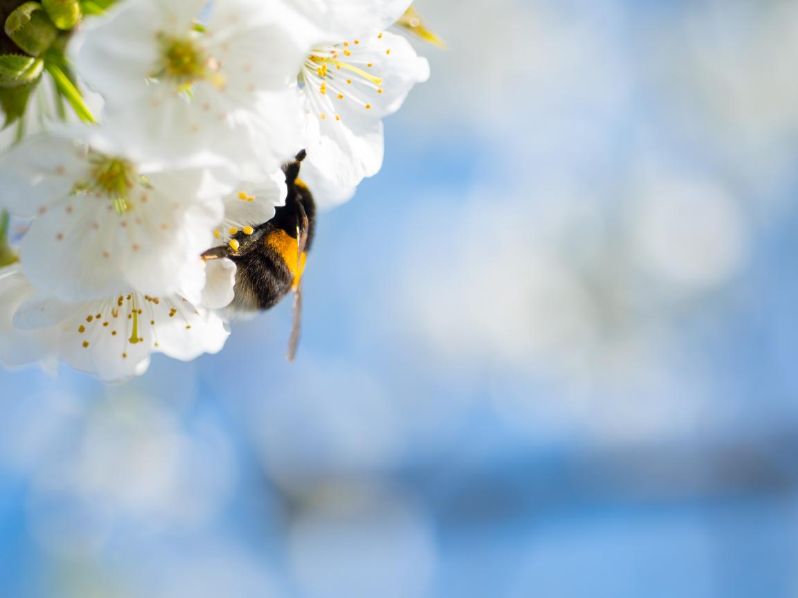 Обои Шмель сидит на белых цветах вишни на фоне неба