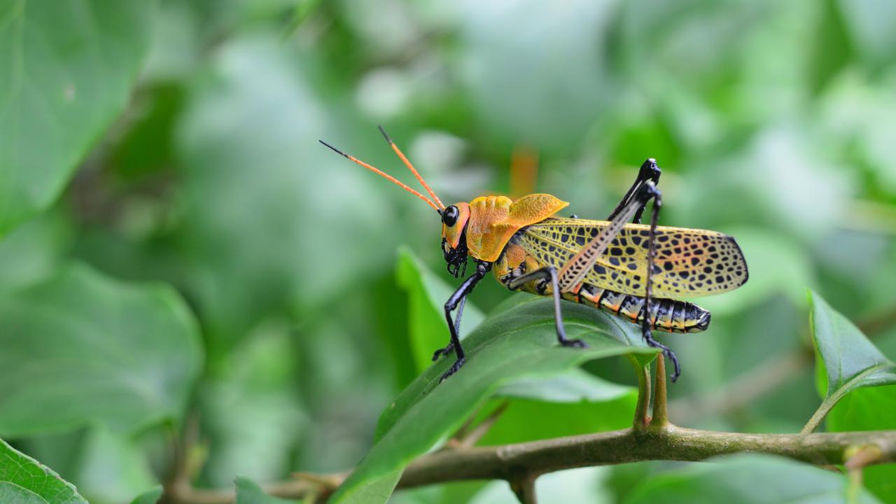 Обои Большой желтый кузнечик сидит на зеленой ветке