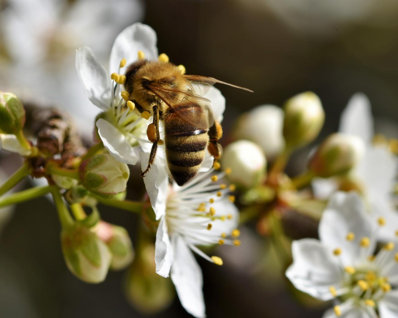 Обои Большая пчела собирает нектар с белых цветов вишни