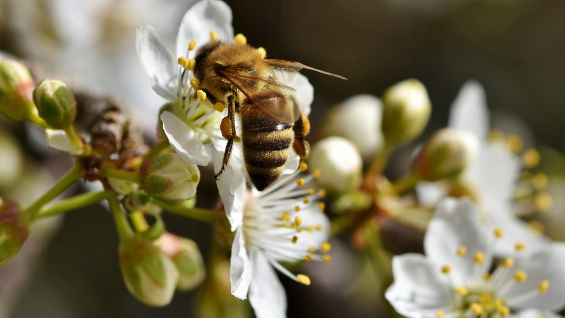 Обои Большая пчела собирает нектар с белых цветов вишни