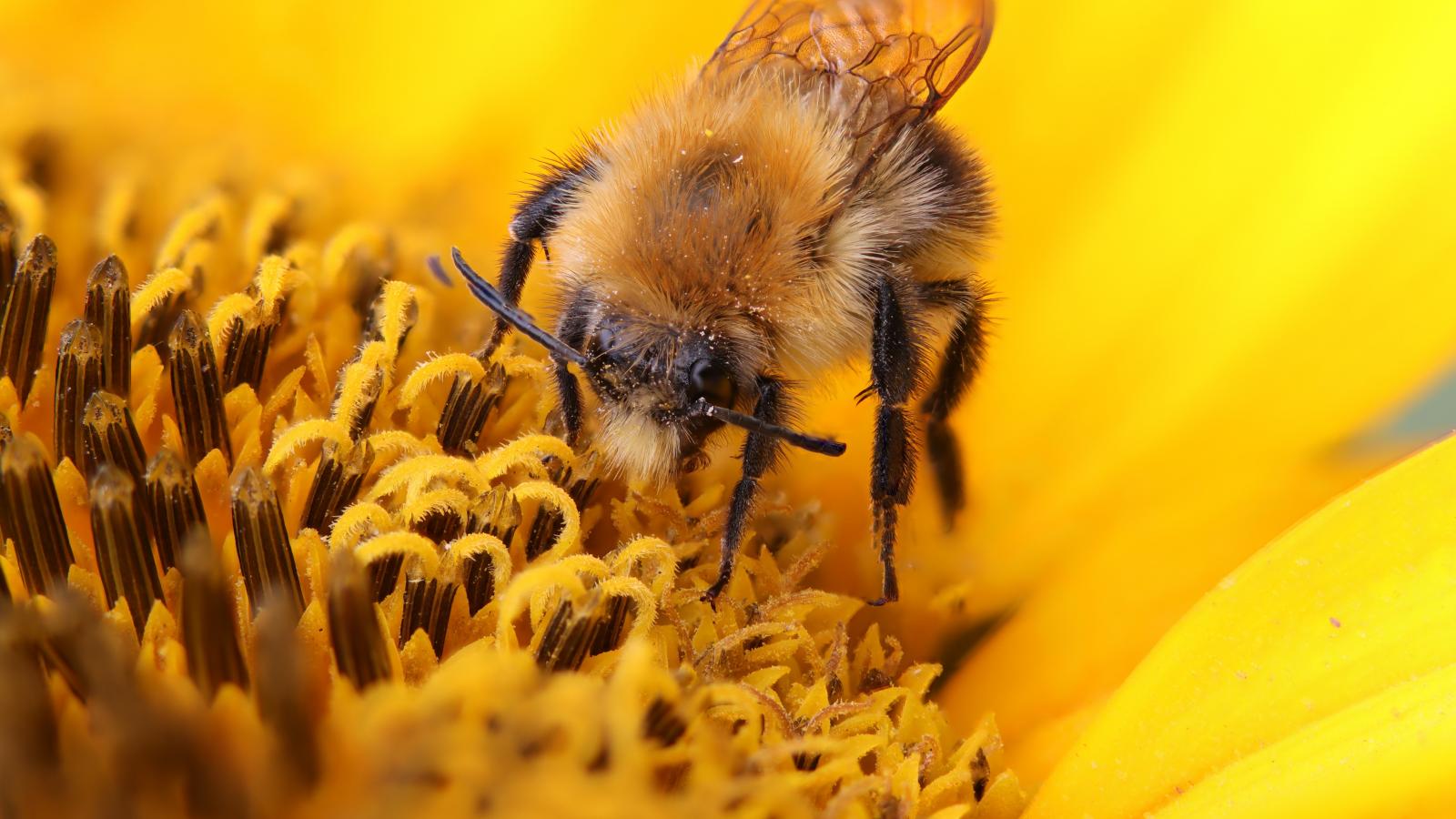 Обои Пчела собирает сладкий нектар на цветке подсолнуха
