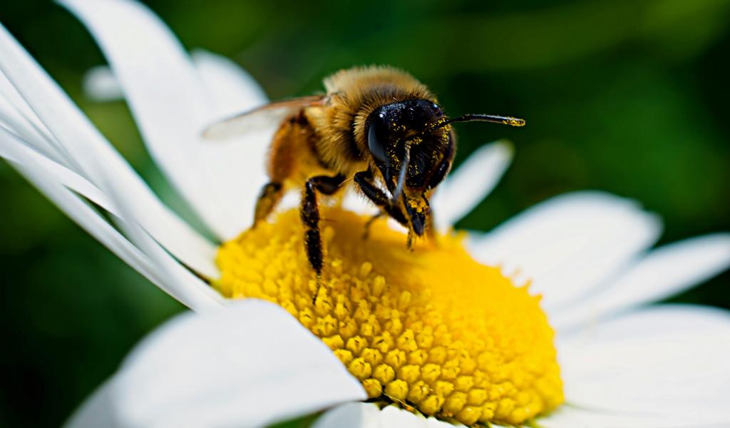 Обои Большая пчела сидит на белом цветке ромашки