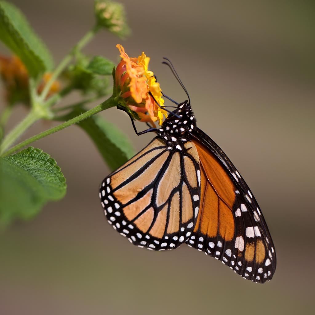 Обои Бабочка сидит на оранжевом цветке крупным планом
