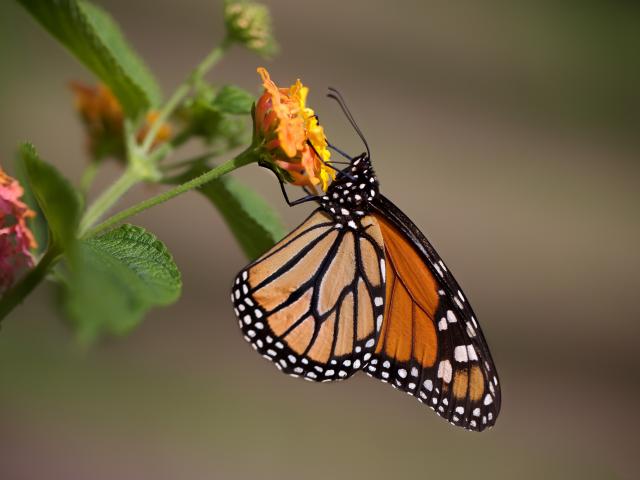 Обои Бабочка сидит на оранжевом цветке крупным планом