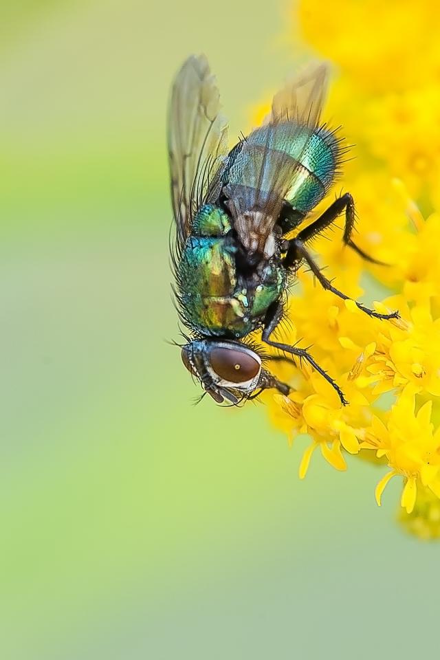 Обои Зеленая муха сидит на желтом цветке