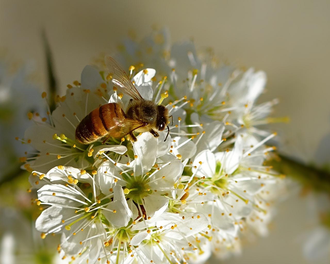 Обои Пчела сидит на цветущей ветке вишни весной