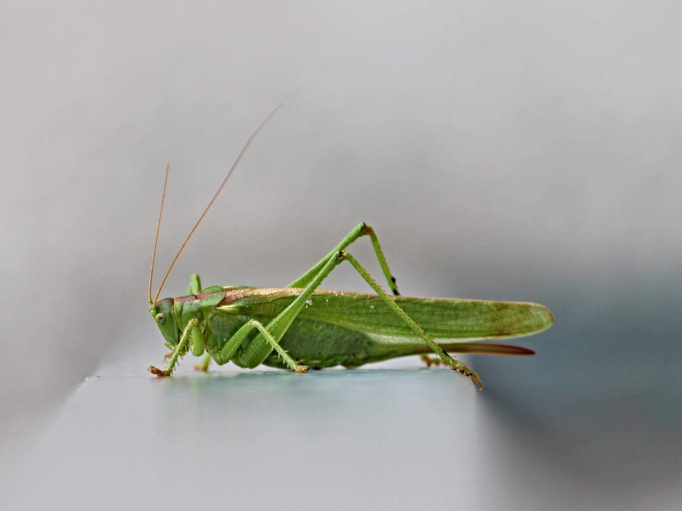 Обои Зеленый кузнечик на сером фоне крупным планом