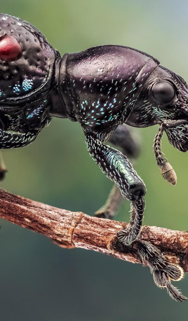 Обои Черный жук долгоносик сидит на ветке дерева