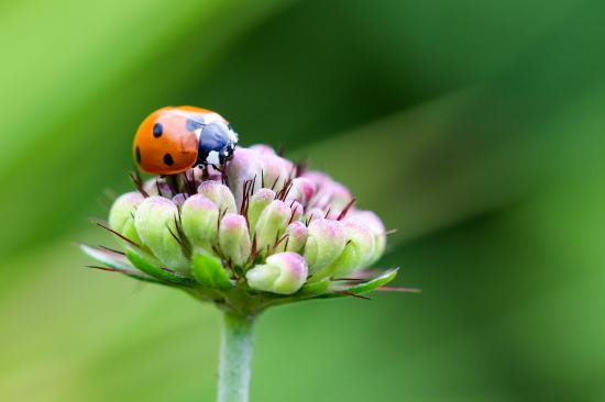 Обои Красная божья коровка сидит на цветке на зеленом фоне