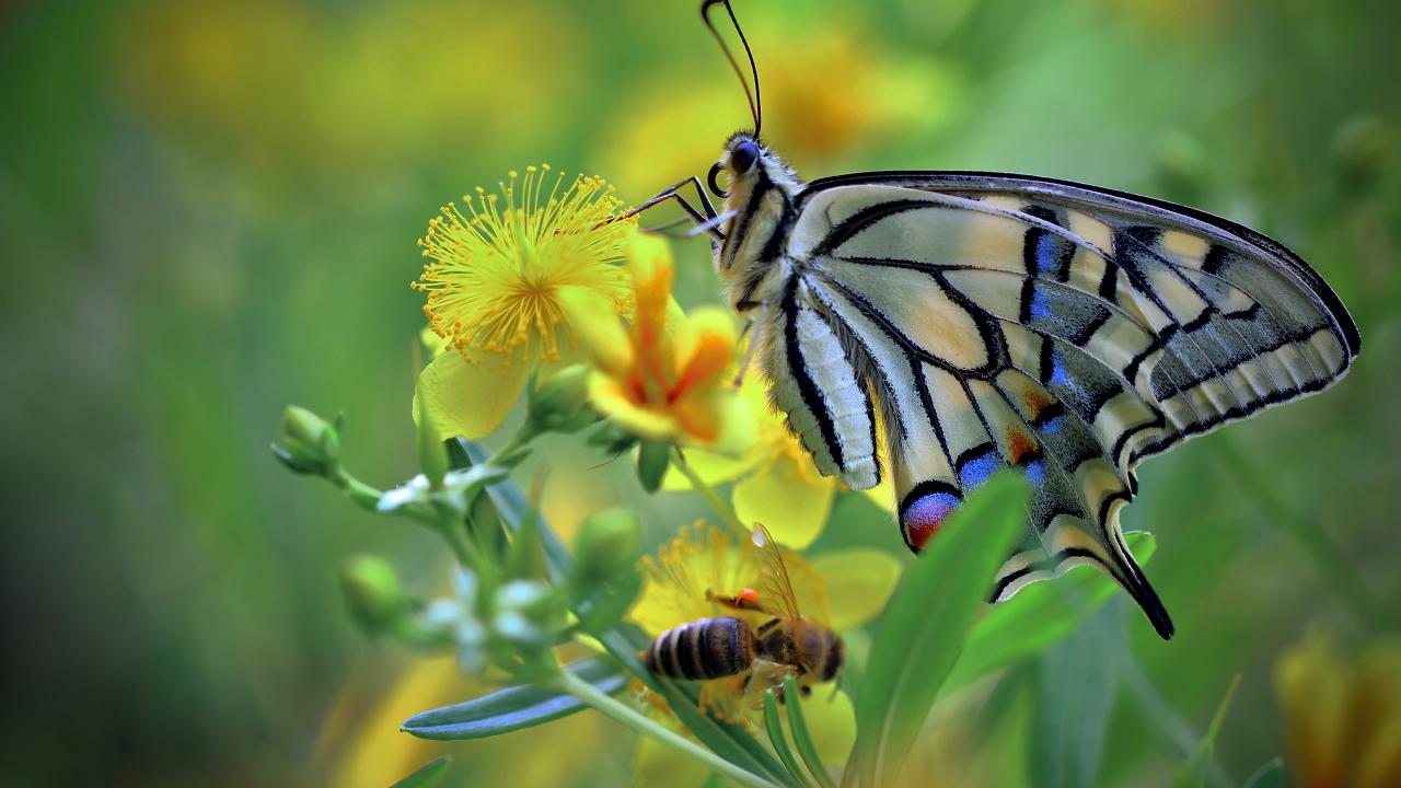 Обои Бабочка махаон и пчела сидят на желтом цветке