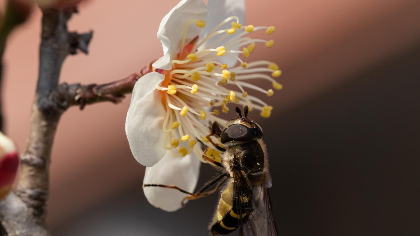 Обои Маленькая пчела сидит на белом цветке весной