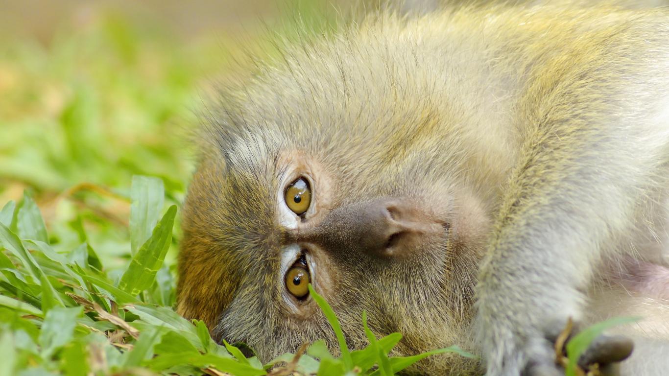 Обои Обезьяна лежит на зеленой траве