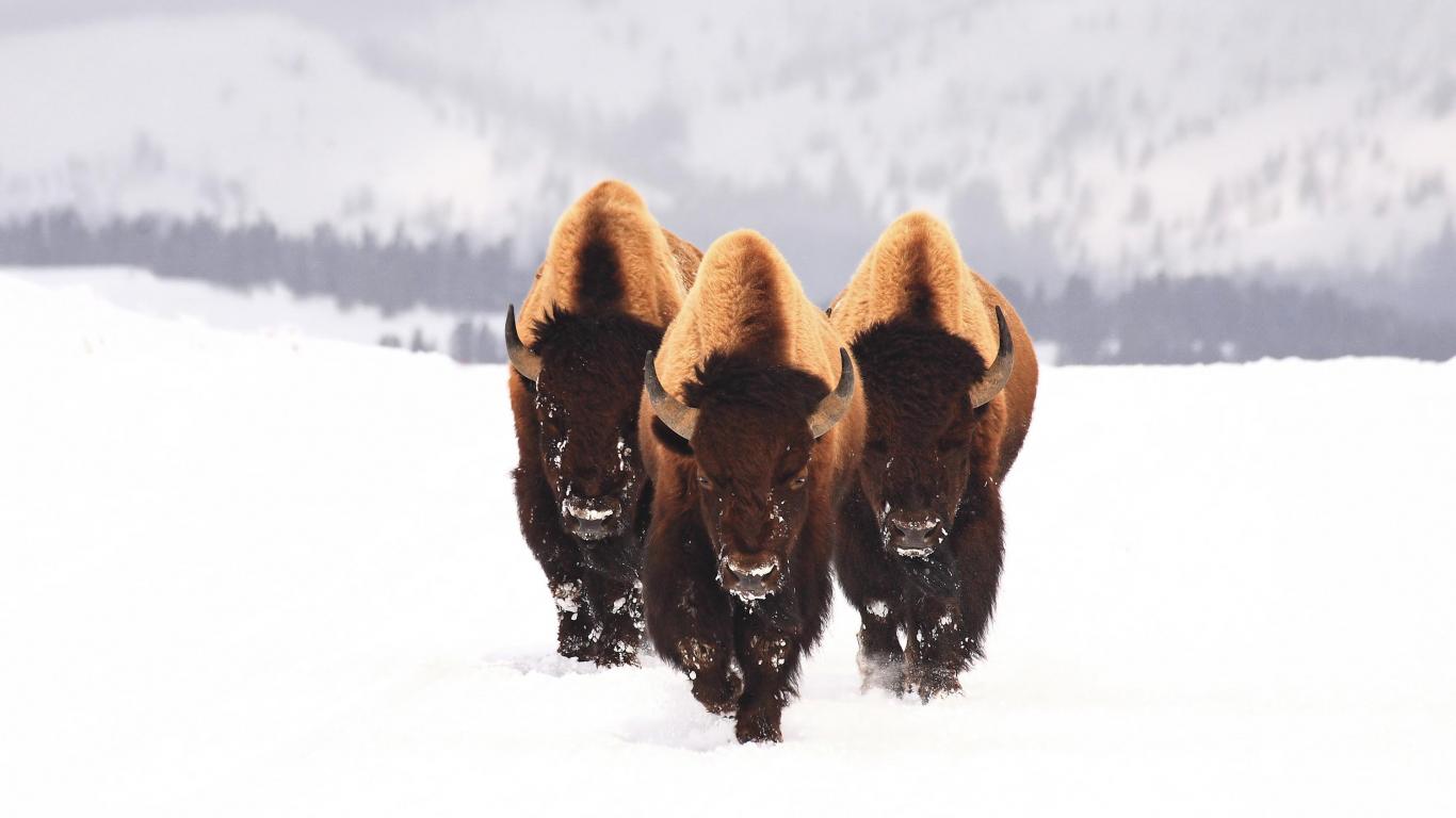 Обои Три бизона идут по заснеженному полю зимой