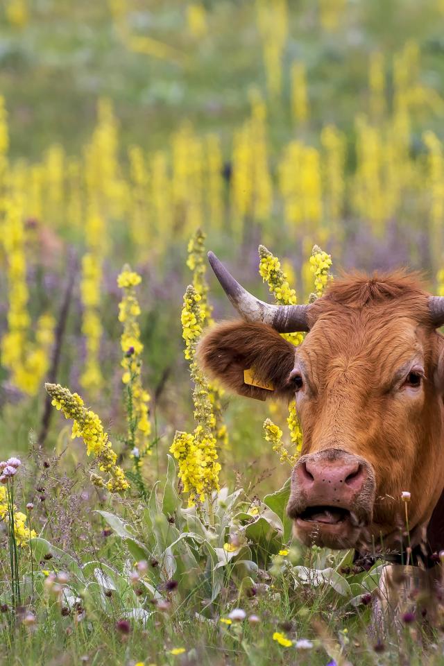 Обои Большие коричневые коровы пасутся на поле с цветами