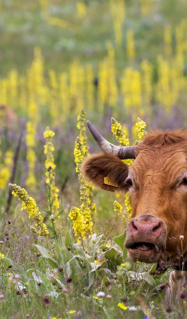Обои Большие коричневые коровы пасутся на поле с цветами