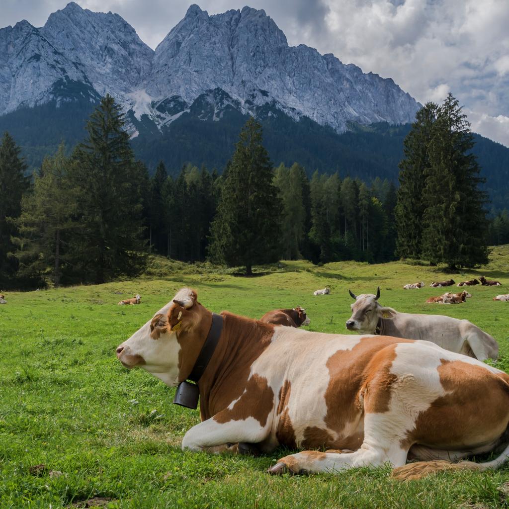 Обои Коровы пасутся на альпийском луге на фоне гор