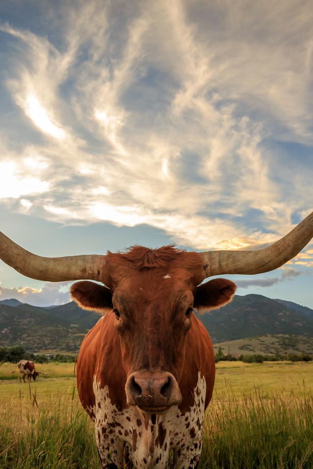 Обои Бык с большими рогами на фоне красивого неба
