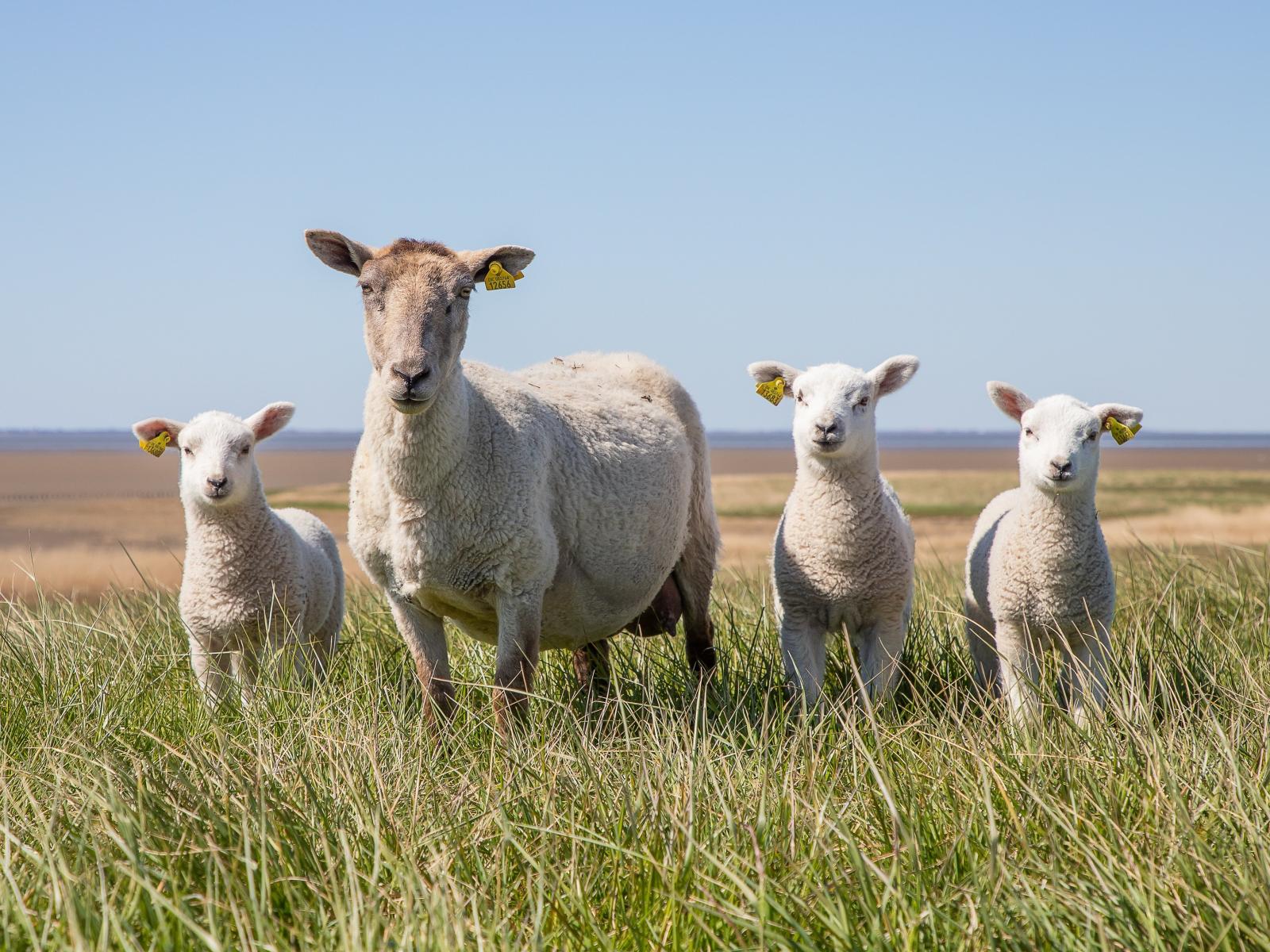 Обои Большая овца с ягнятами на зеленой траве
