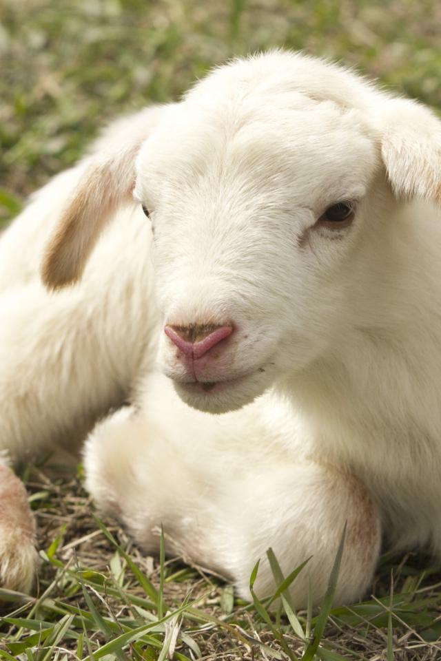 Обои Маленький белый ягненок лежит на траве