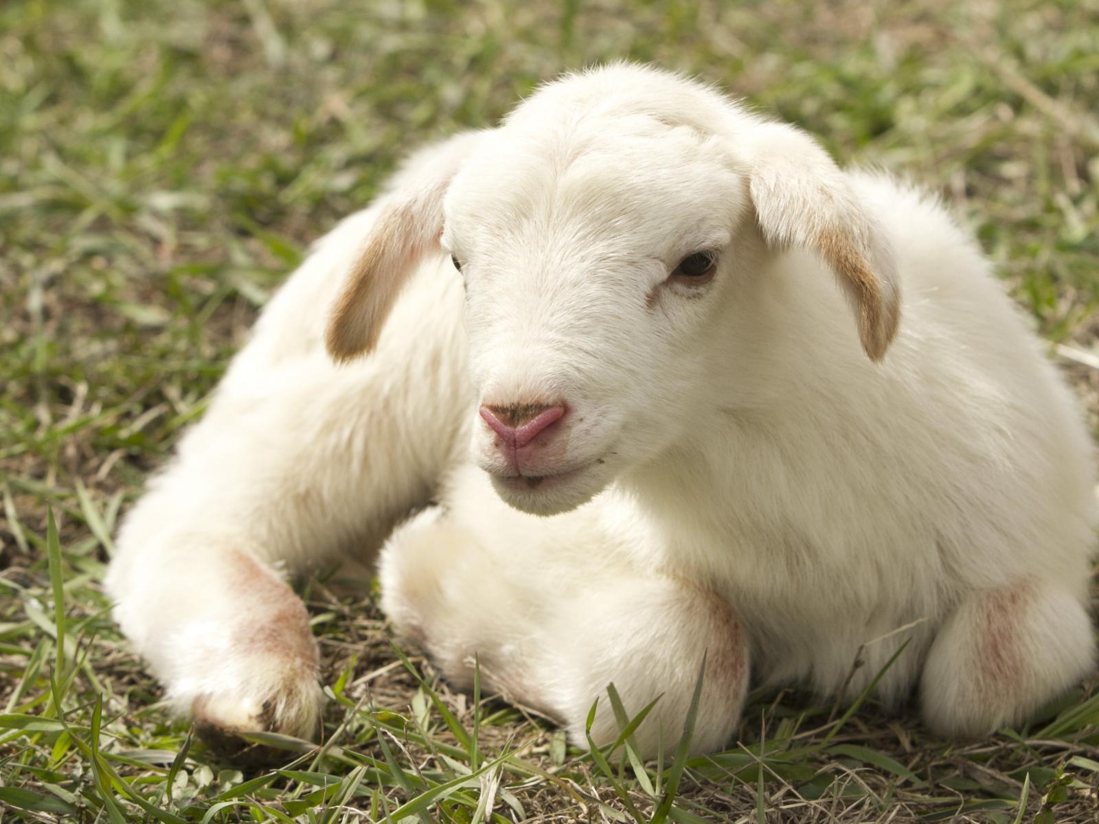 Обои Маленький белый ягненок лежит на траве