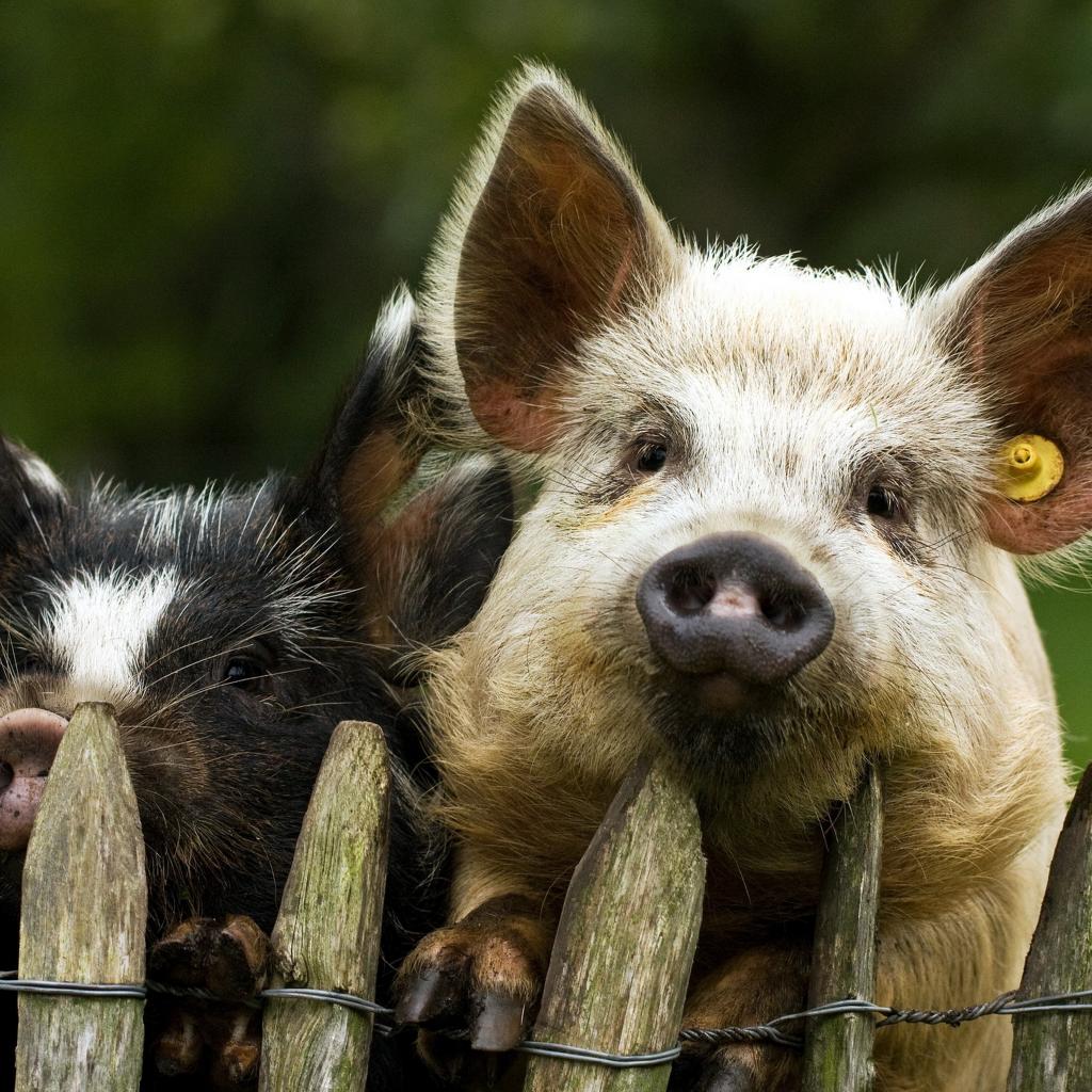 Обои Две маленькие дикие свиньи стоят на зеленой траве