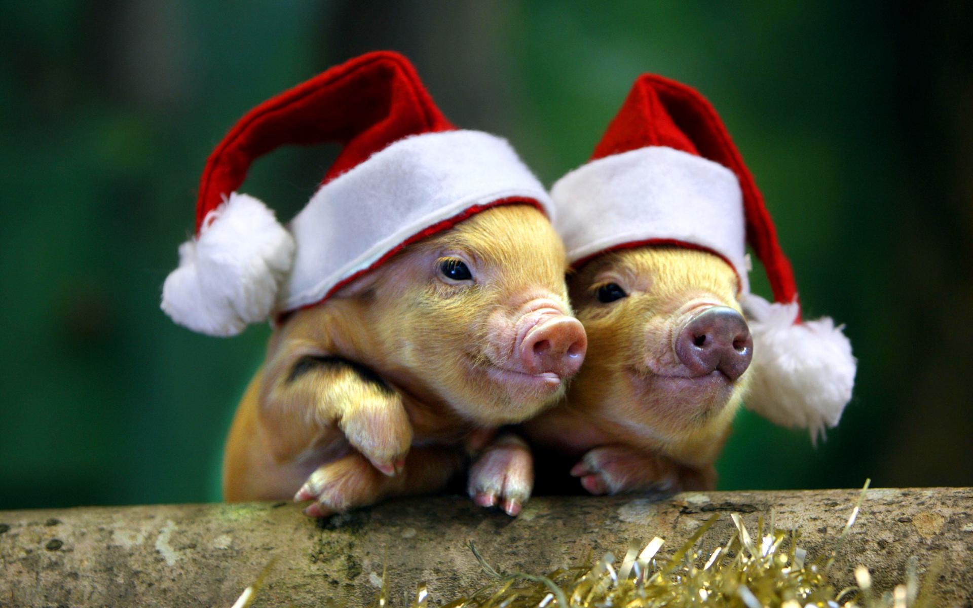 Обои Два поросенка в новогодних шапках, символ нового года 2019