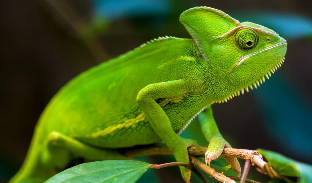 Обои Зеленый хамелеон на ветке крупным планом