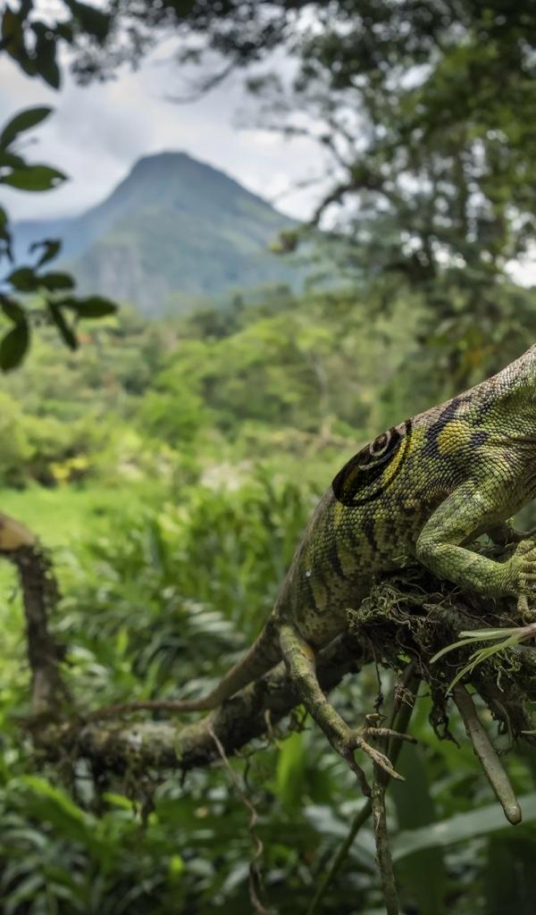 Обои Зеленая большая ящерица на ветке дерева