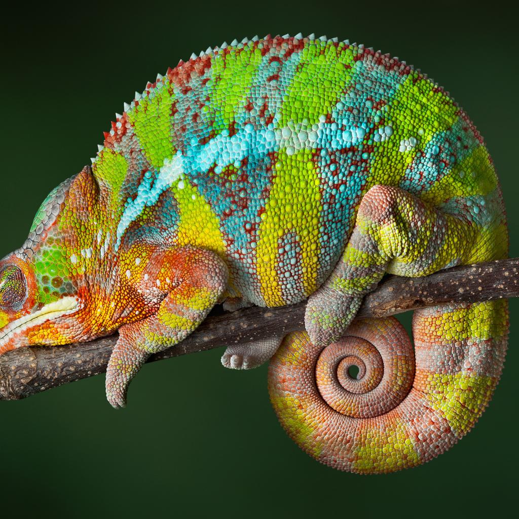 Обои Красивый разноцветный хамелеон сидит на ветке