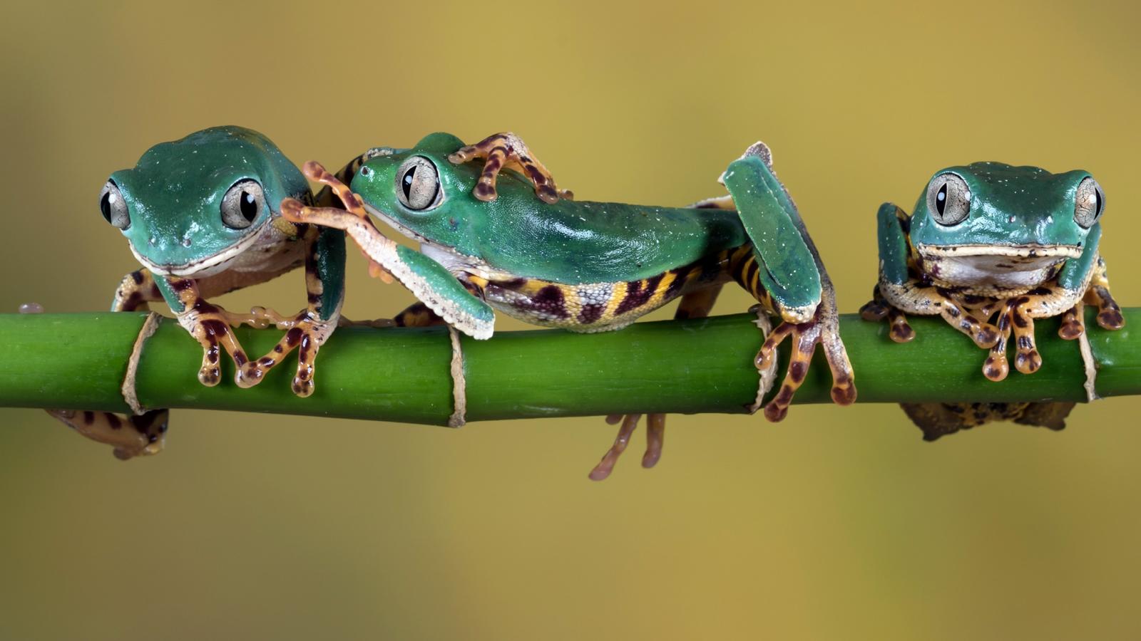 Обои Три зеленые лягушки сидят на зеленой ветке