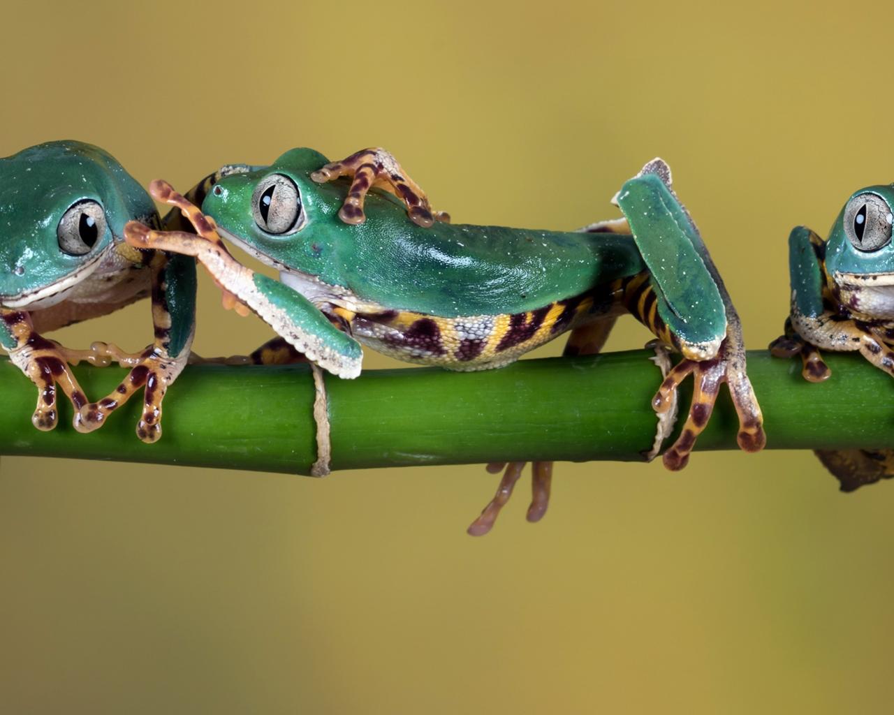 Обои Три зеленые лягушки сидят на зеленой ветке