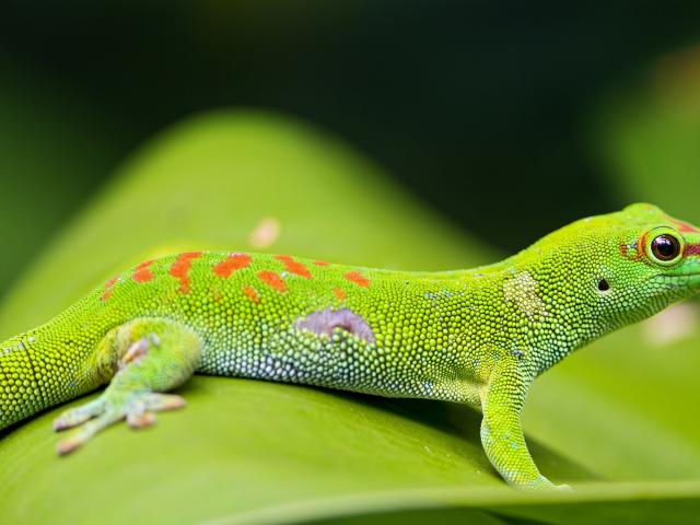 Обои Красивый зеленый геккон на зеленом листе