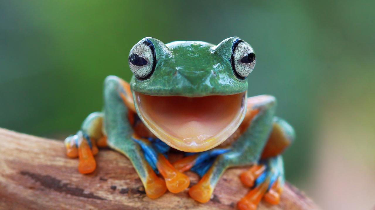 Обои Забавная зеленая лягушка с открытым ртом