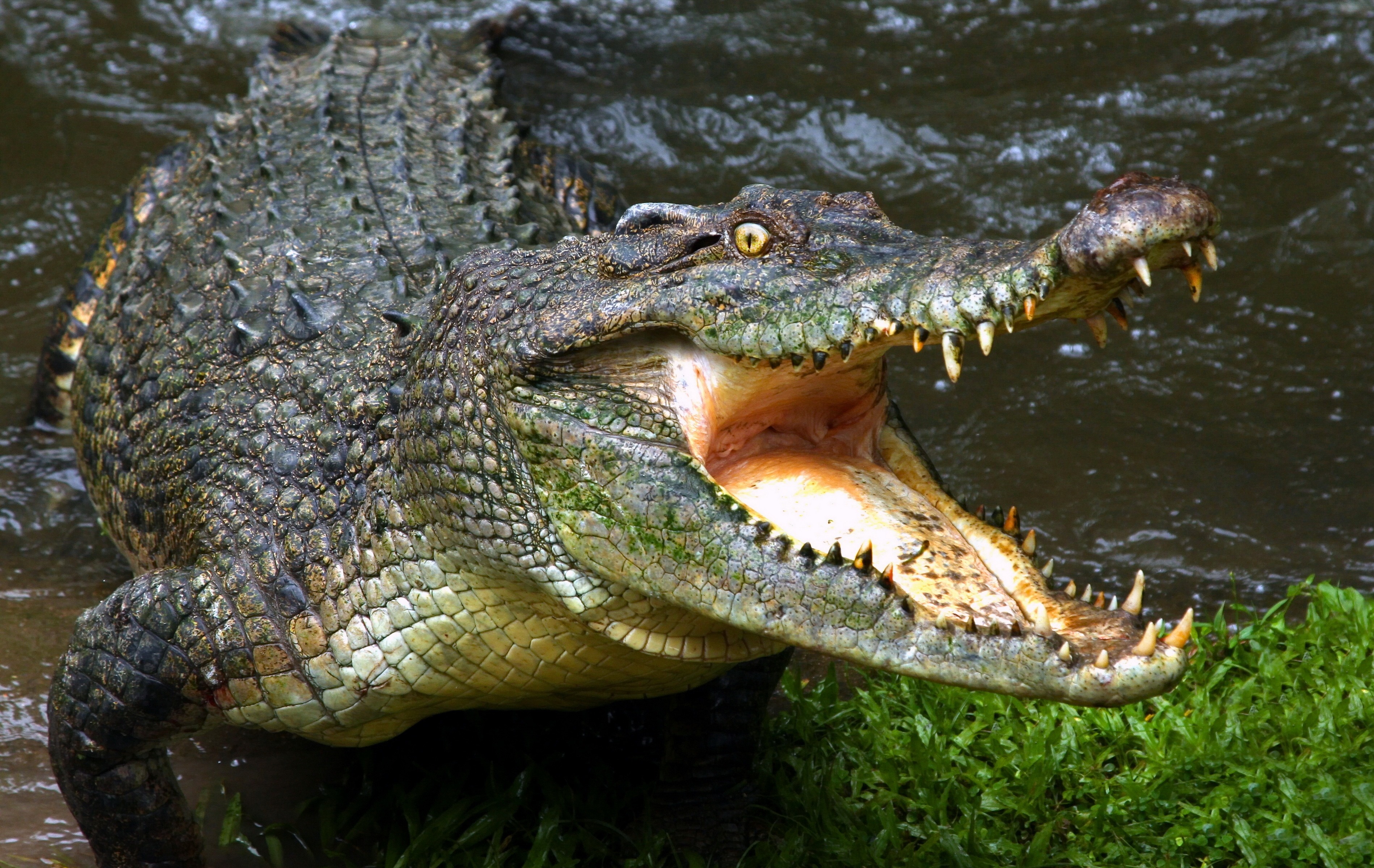 Обои Зубастый крокодил с открытой пастью у водоема