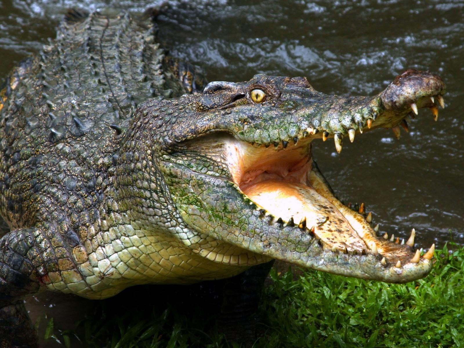 Обои Зубастый крокодил с открытой пастью у водоема