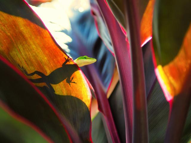 Обои Маленькая зеленая ящерица сидит на большом листе