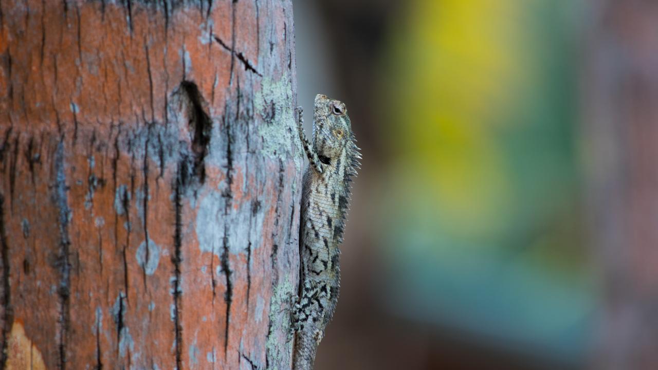 Обои Маленькая ящерица на стволе дерева