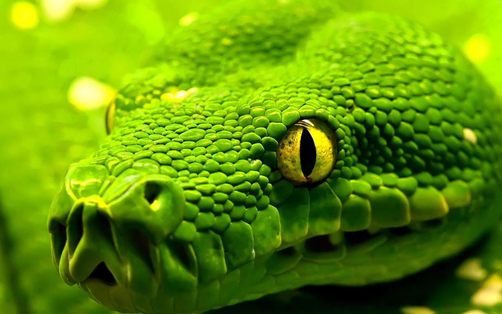 Обои Большая зеленая змея с желтыми глазами крупным планом