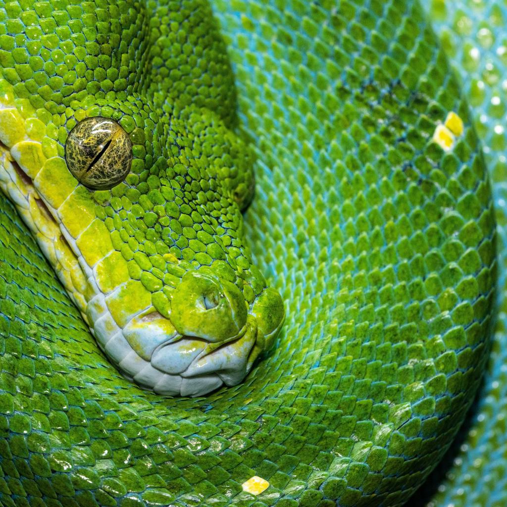 Обои Большая зеленая змея с желтыми глазами крупным планом
