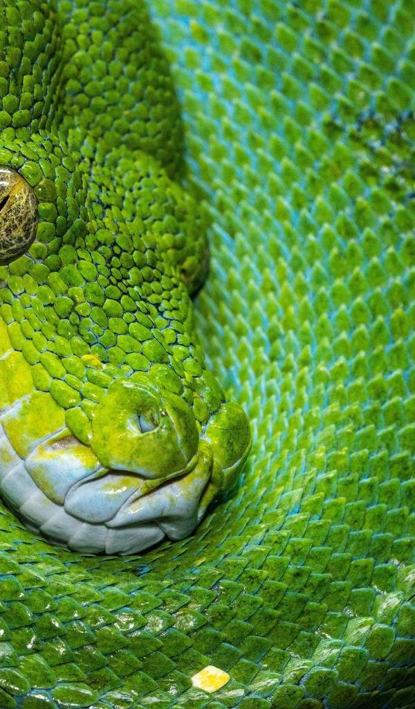 Обои Большая зеленая змея с желтыми глазами крупным планом