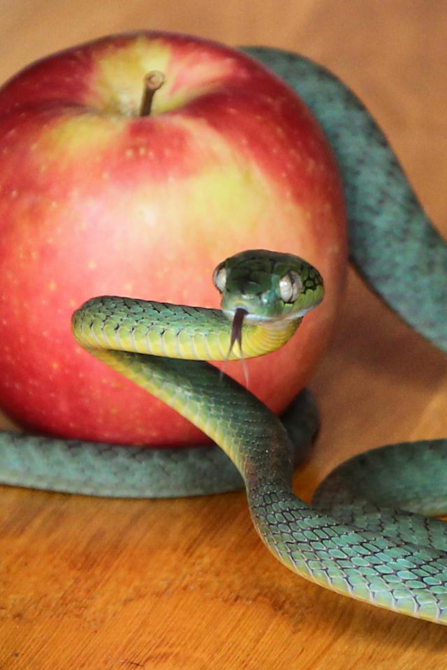 Обои Зеленая змея с красным яблоком на столе